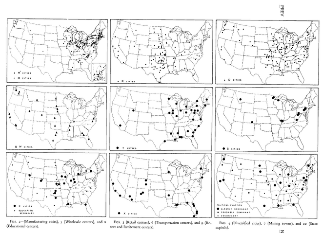 自上而下分別為,美國⑴制造業城市⑵批發中心城市⑶教育中心城市⑷零售中心城市⑸交通樞紐城市(鐵路和港口)⑹退休和度假勝地⑺“多功能”城市(貿易與制造業同等發展,但皆非占據主要地位)⑻礦產城市⑼州首府的分布情況。