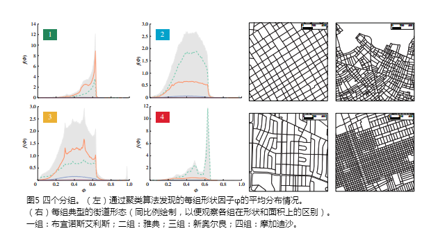 他們將那些城市地塊的尺寸、形狀繪制出來:有些城市的地塊形狀統一;另一些則有更多小型、曲線圍成的地塊。他們比較了地塊的不同分布,將眾多城市劃入四個不同“組別”: