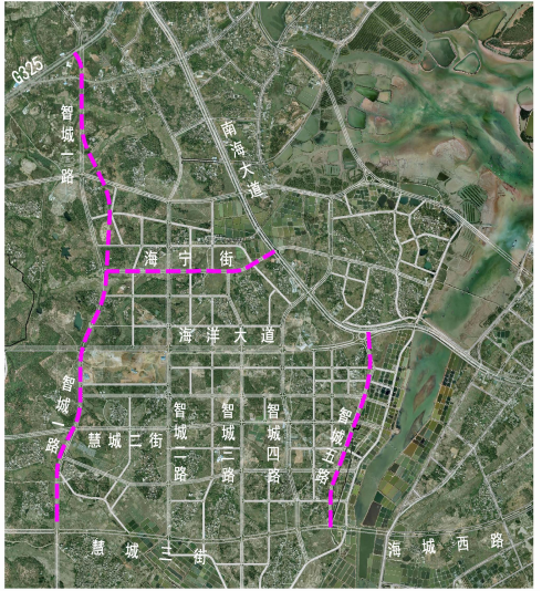 本次設(shè)計(jì)包括智城一路、智城五路、海寧街三條市政道路。智城一路為高地智慧城內(nèi)南北走向的城市主干路,南起慧城三街,北至325國(guó)道,路線全長(zhǎng)5198.815m,紅線寬度40m,設(shè)計(jì)速度60km/h。智城五路為高地智慧城內(nèi)南北走向的城市次干路,南起慧城三街,北至南海大道,路線全長(zhǎng)2158.647m,紅線寬度36m,設(shè)計(jì)速度50km/h。海寧街為高地智慧城內(nèi)東西走向的城市次干路,西起智城一路,東至南海大道,路線全長(zhǎng)1862.438m,紅線寬度36m,設(shè)計(jì)速度40km/h。道路沿線主要為村莊及待開發(fā)用地,道路用地主要包括農(nóng)民的居住用地、耕地、菜地、苗圃、山丘、林地和魚蝦塘等等,局部地段有嶺地、河流、石化管線及高壓線穿過(guò),既有建筑物較多,類型包括民宅、祠堂、學(xué)校等,且與G325、S280、海洋大道及多條村道等既有道路存在多次交叉。